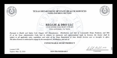 ✅ Reggie & Dro LLC operates under State of Texas DSHS Consumable Hemp Product License #690. See copy of current license below.